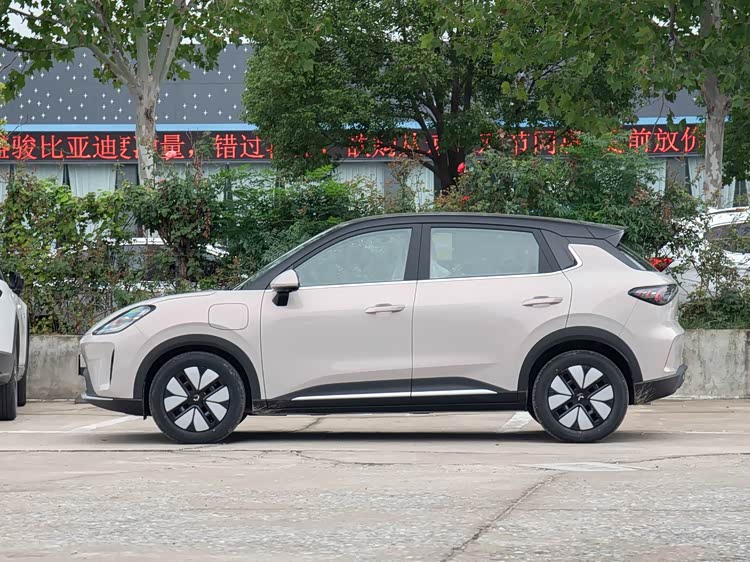 再来看车身侧面部分,车身定位A0级纯电两厢车,整体线条圆润流畅,以灵活好开为核心设计思路,同时最大化利用车内空间。车身尺寸为4265×1785×1600mm,轴距达2560mm,在同级别车型中表现出色,车身紧凑,转弯半径小,无论是城市拥堵路段穿梭,还是狭窄车位泊车,都能轻松应对,非常适合新手驾驶。侧面线条顺滑舒展,贯穿式腰线从车头延伸至车尾,勾勒出灵动的车身姿态,搭配悬浮式车顶设计,提升时尚感。车门配备普通门把手,兼顾实用性与便捷性。