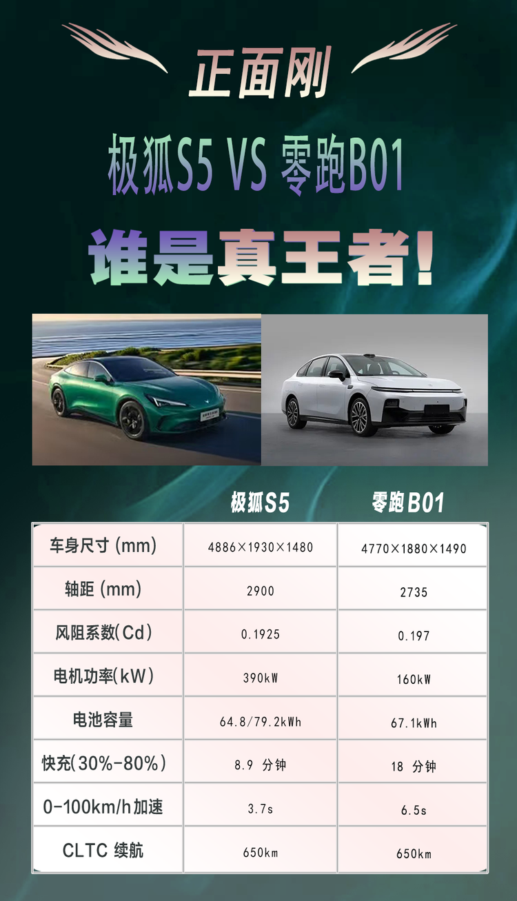 动力方面,极狐全新阿尔法S5提供390千瓦的双电机版本,零跑B01和小鹏MONA 03都是160千瓦。加速表现上,极狐S5的0-100km/h加速是3.7秒,零跑B01是6.5秒,小鹏MONA 03是7.4秒。3.7秒的加速能力意味着极狐S5的性能储备非常充足。虽然不是每个人都需要这么强的加速,但有高性能版本可选,至少说明极狐S5的平台基础很好。而且极狐S5提供不同动力版本,用户可以根据自己的预算和需求选择。