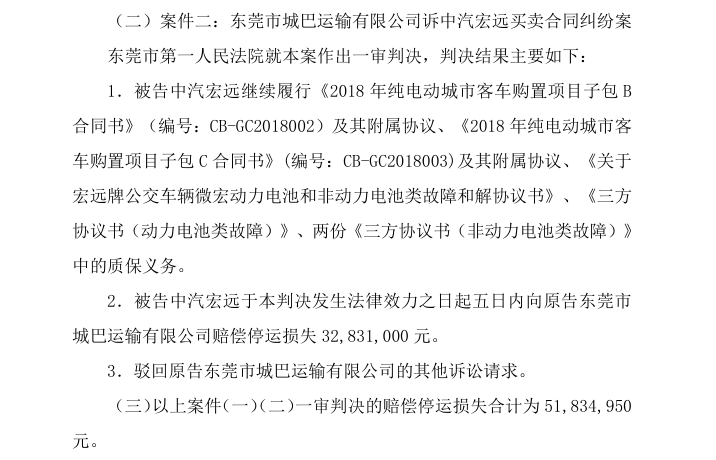 2026年2月9日及12日,龙洲股份先后公告了这三起重大诉讼的一审进展,法院最终作出了部分支持原告诉求的判决。判决明确,中汽宏远需继续履行合同中的质保义务,保障涉案车辆的后续维修维保相关事宜——这也意味着,中汽宏远需持续处理故障车辆的电池维修或更换问题,确保车辆能够正常投入运营。
