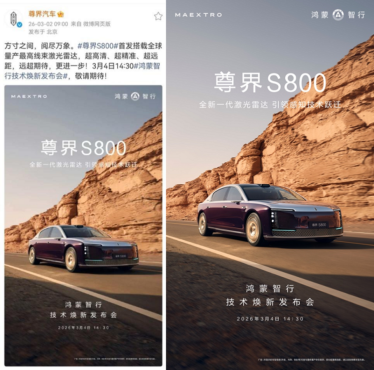 作为鸿蒙智行旗舰之作,尊界S800再度成为华为智能汽车旗舰技术的首发载体,以黑科技持续刷新超豪华车的体验边界,也让人们对3月4日的技术焕新发布会充满期待:这场智驾感知的革命,到底有多惊艳?