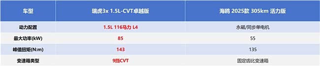问题随之而来,携家带口、满载年货加上车多路堵,对座驾提出了更高的考验。今天,我们就聚焦自驾场景,对比两款备受年轻人追捧的热门小车:奇瑞瑞虎3x 1.5L-CVT卓越版(以下简称:瑞虎3x卓越版)和海鸥 2025款 305km 活力版(以下简称:海鸥),看谁更值得入手?