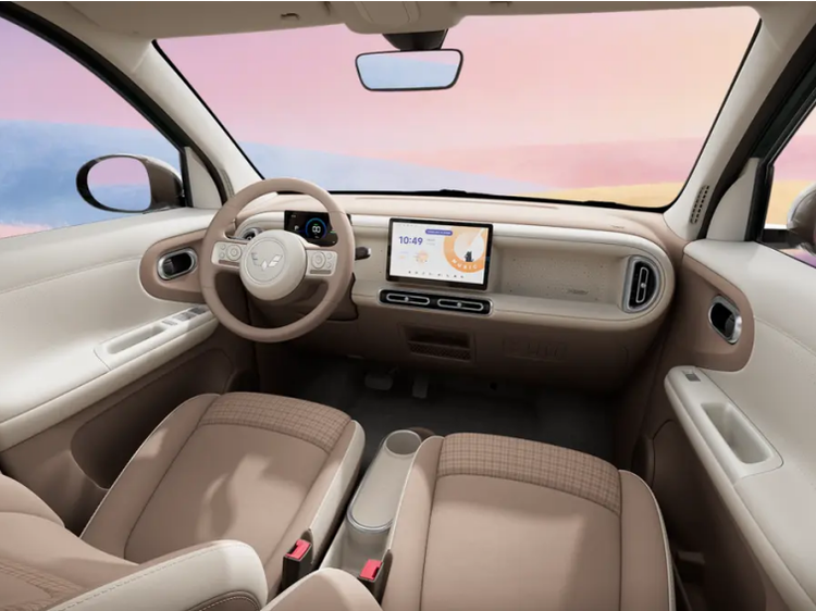 内饰方面,第五代宏光MINI EV内饰采用“焦糖奶油”主题色,棕色格子座椅颇具复古气息,换挡方式升级为怀挡,中控屏尺寸达到10.1英寸,细节处以“星钻流光”饰条点缀,前排座椅靠背可向后放倒至164°,车内的储物空间达20处,后备厢容积达838L。