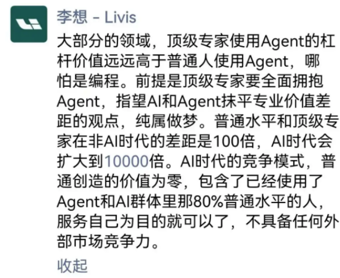 先说说李想最近的发言,基本上全是实在的判断,甚至带着点“危机感”。前几天他朋友圈发了一句,让人印象很深:“在非AI时代,普通水平与顶级专家的差距大约是100倍;而在AI时代,这个差距会扩大到10000倍。” 他还直言,期待AI抹平专业差距“纯属做梦”,AI只会成为放大镜,让强者更强、弱者更弱。