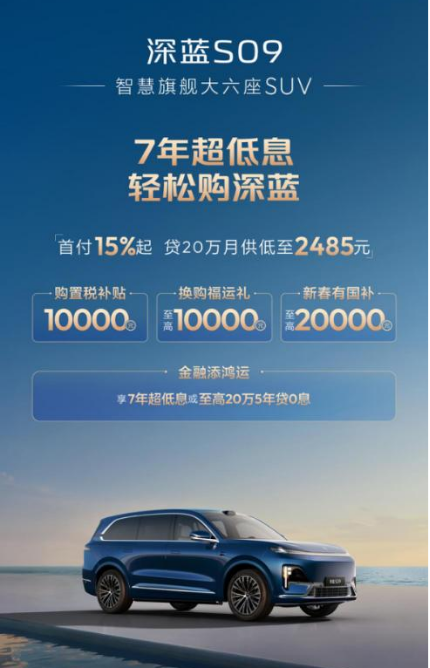 除了车辆本身的性能和配置,购车政策也是很多人在选择车时需要考虑的重要因素。2026年深蓝S09春节购车权益:购置税补贴10000元,换购至高10000元,新春国补至高20000元,同时还有金融福利,7年超低息或至高20万5年0息,首付15%起,贷款20万元月供低至2485元。算下来,直接省下好几万,对于准备买车返乡的家庭来说,性价比直接拉满。