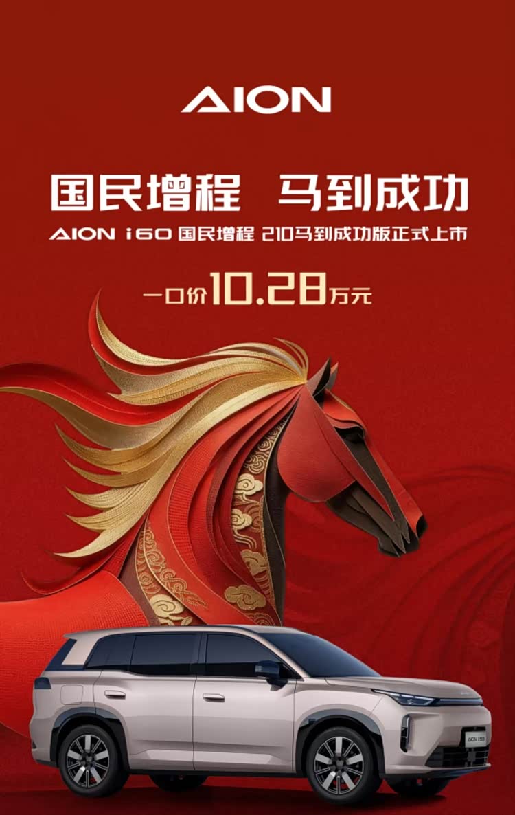 埃安i60马到成功版让增程技术走下神坛,以10.28万价格将高端体验带给普通家庭。它不玩噱头、不搞减配,把普通人最需要的东西做到极致,是精打细算家庭“闭眼冲”的选择,更是全家幸福出行的可靠伙伴。