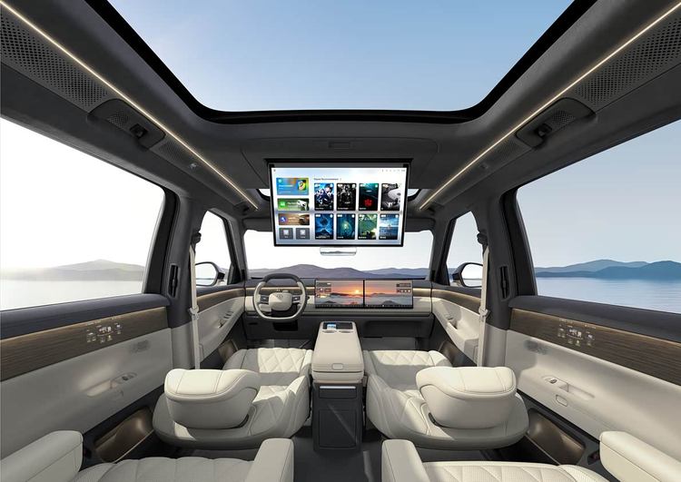 大众 ID.ERA 9X这款车的内饰,科技感强的都不像一台大众的车,15.6英寸超高清中控主副驾双联屏,21.4英寸后排可折叠吸顶大屏,对比理想L9的15.7 英寸中控屏 和后排 21.5 英寸娱乐屏根本是不落下风,车长宽高分别为5207/1997/1810mm,轴距为3070mm,尺寸不算小。2+2+2 六座布局,第二排航空座椅 (18 向调节、通风加热按摩、电动腿托),第三排腿部空间超 980mm,践行了六座平权的思想。