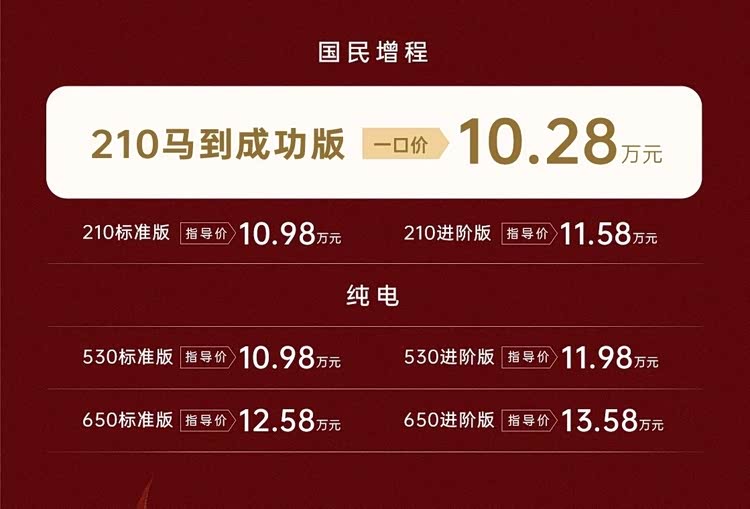 与增程210标准版(官方售价:10.98万元)相比,增程210马到成功版减少副驾座椅电动调节、后排中间头枕、后排扶手带杯架、电动尾门+记忆功能、皮质方向盘、遮阳板带灯化妆镜、外后视镜电动调节/加热/锁车自动折叠、全景天幕带电动遮阳帘等等,同时选装配置范围有所收窄,不提供双色车身、11扬声器音响等给用户选择。