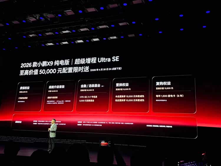 此外,新款 X9 纯电版赠送三电终身质保权益、座椅升级套装,并且为用户提供金融、置换、复购权益。