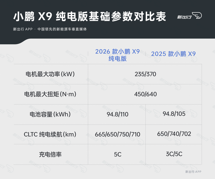 纯电续航方面,2026 款小鹏 X9 纯电版 94.8kWh 磷酸铁锂电池根据配置不同对应 CLTC 纯电续航 665km 和 650km;110kWh 三元锂电池根据动力不同对应 CLTC 纯电续航 750km 和 710km。