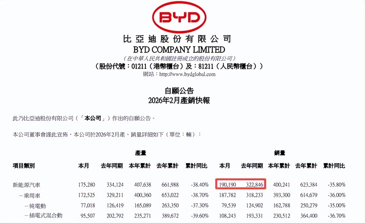 2026年,比亚迪1-2月累计销量400,241 辆,同比下降35.8%,这意味着,开年两个月的颓势,不是单月波动,而是趋势性下滑。