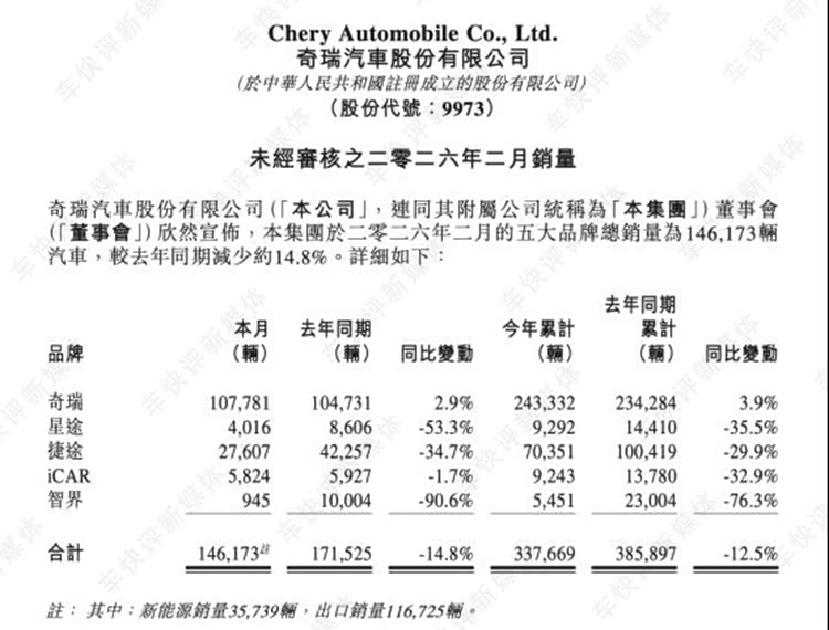 根据奇瑞汽车近日公布的2月产销快报数据显示,智界品牌销量仅为945辆,同比下降了90.6%。今年一到二月,智界品牌累计销量5451辆,相比去年同期降幅也达到了76.3%,是奇瑞旗下五大品牌中降幅最高的品牌。