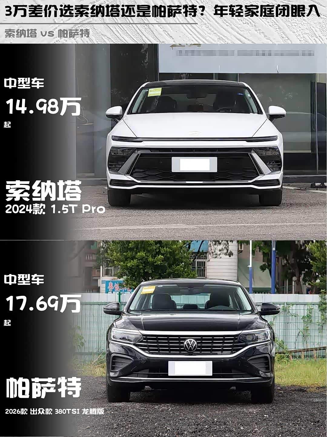 最近在选B级车的小伙伴看过来!今天深度对比两款热门选手—— 索纳塔(参数|询价) 2024款 1.5T Pro和帕萨特 2026款 出众款 380TSI 龙腾版,实测干货直接上菜!🍜