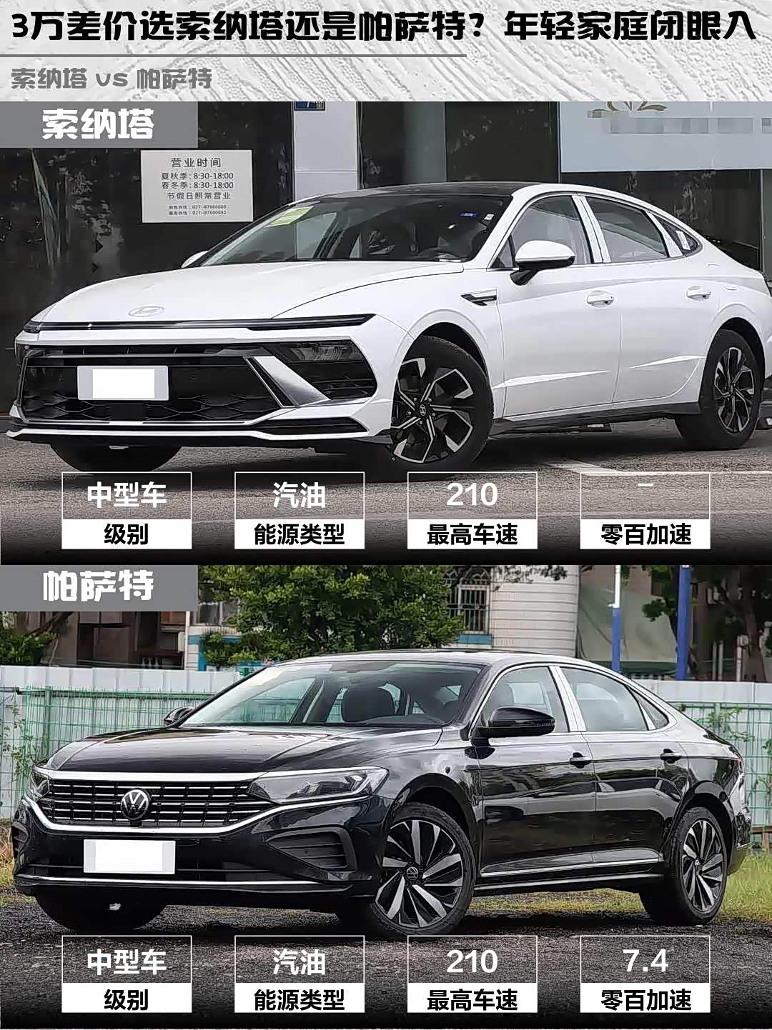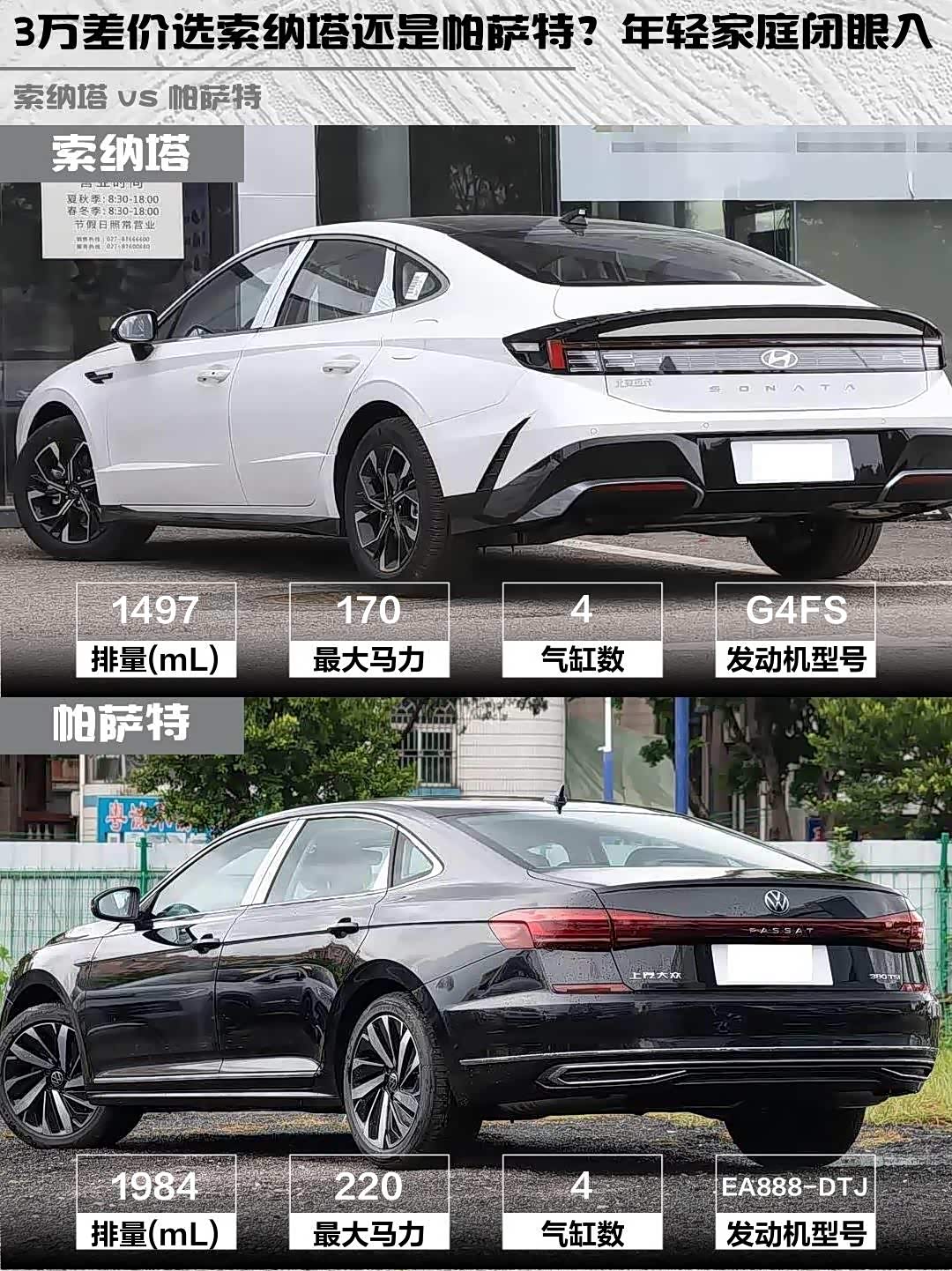 索纳塔1.5T+8AT组合,170马力城市通勤够用,WLTC油耗才6.25L/100km,精打细算党狂喜!帕萨特2.0T高功率220马力,7.4秒破百(官方数据),推背感确实猛,但油耗也飙到6.94L。要激情还是要省油?成年人不做选择...(钱包说:选便宜的!)