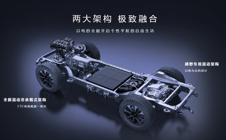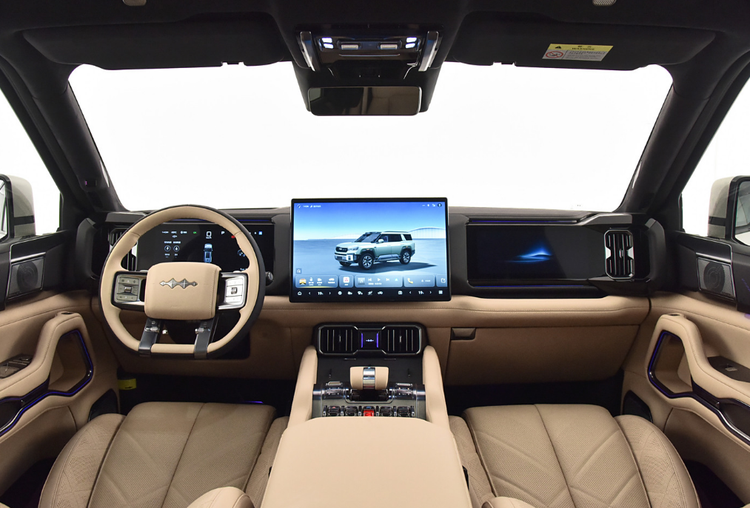 动力系统基于DMO超级混动越野平台打造,采用2.0T发动机与前后双电机组成的四驱系统,综合输出功率550kW,零百加速时间仅需4.8秒。匹配36.864kWh电池组,WLTC纯电续航100km,综合续航突破1200km,馈电百公里油耗仅8.5L。车辆还支持6kW外放电功能,充分满足户外露营等场景的用电需求。