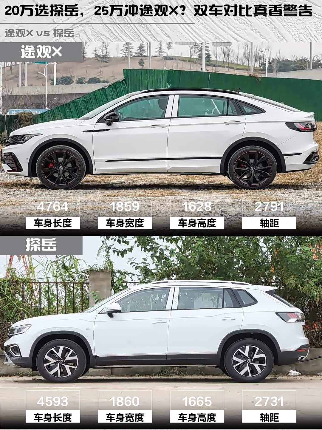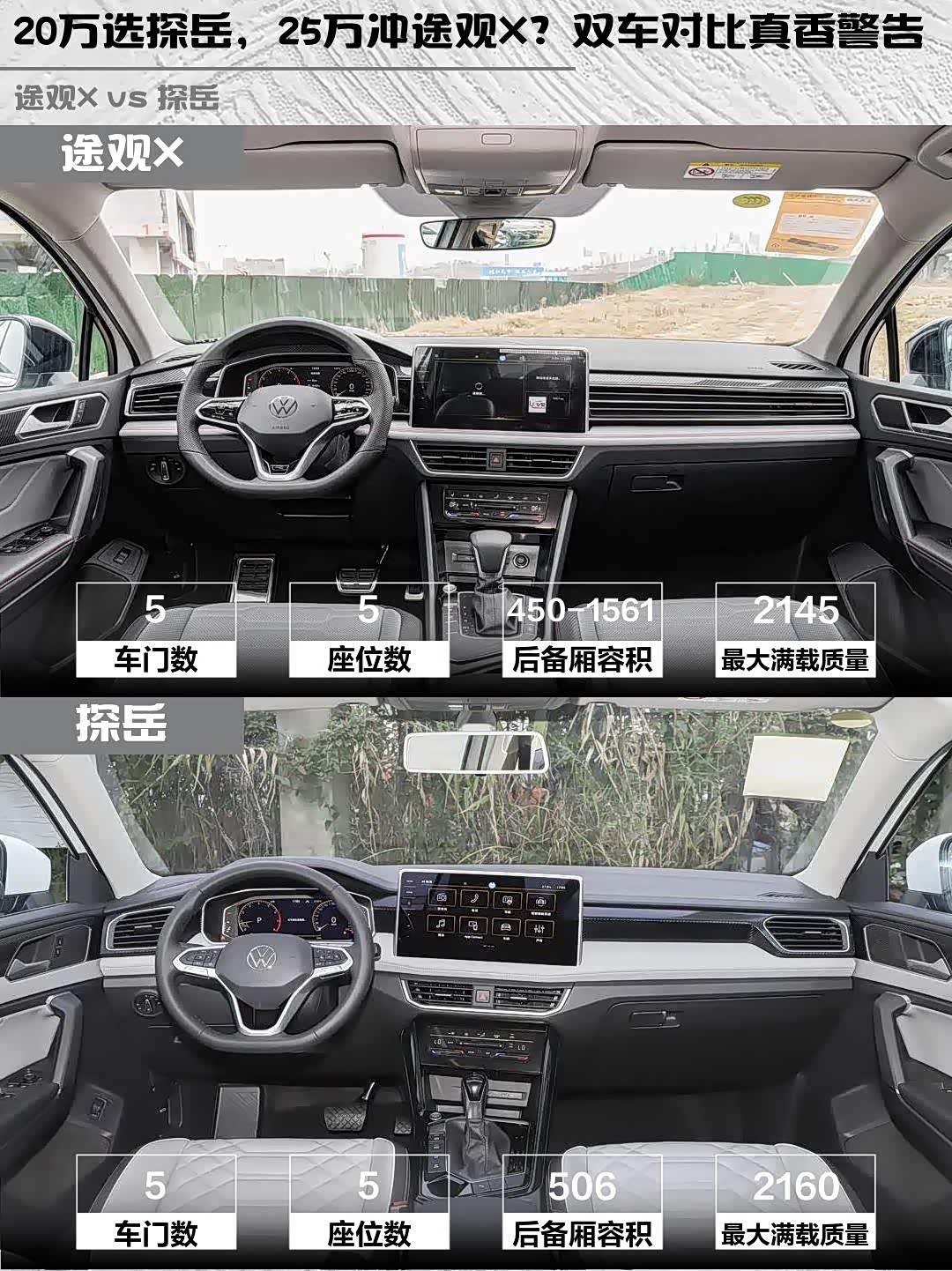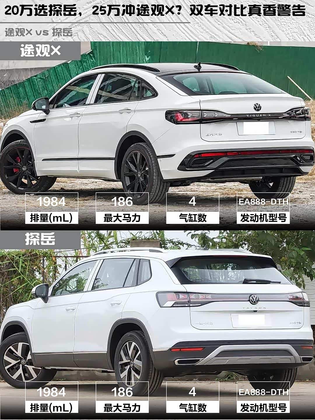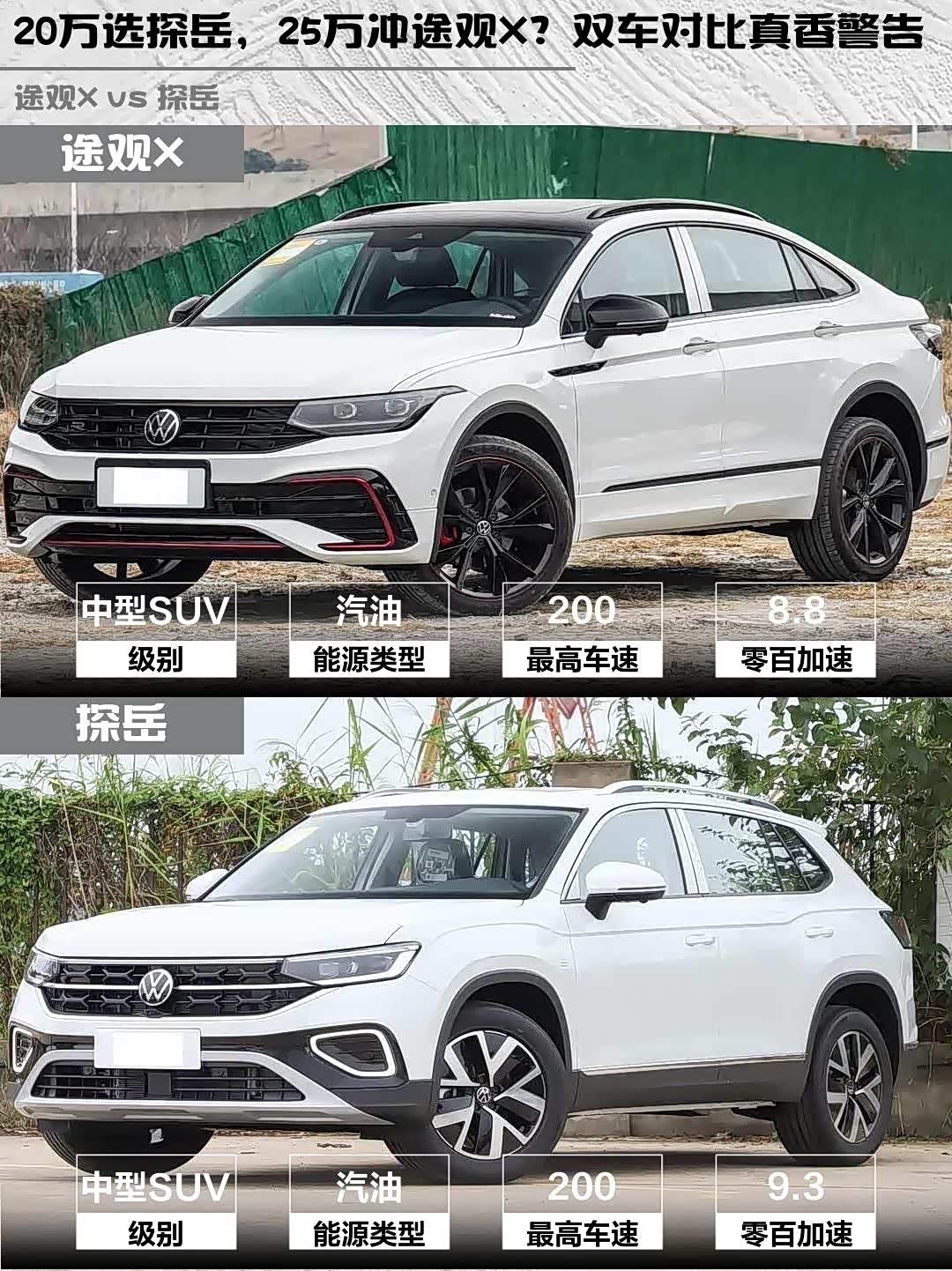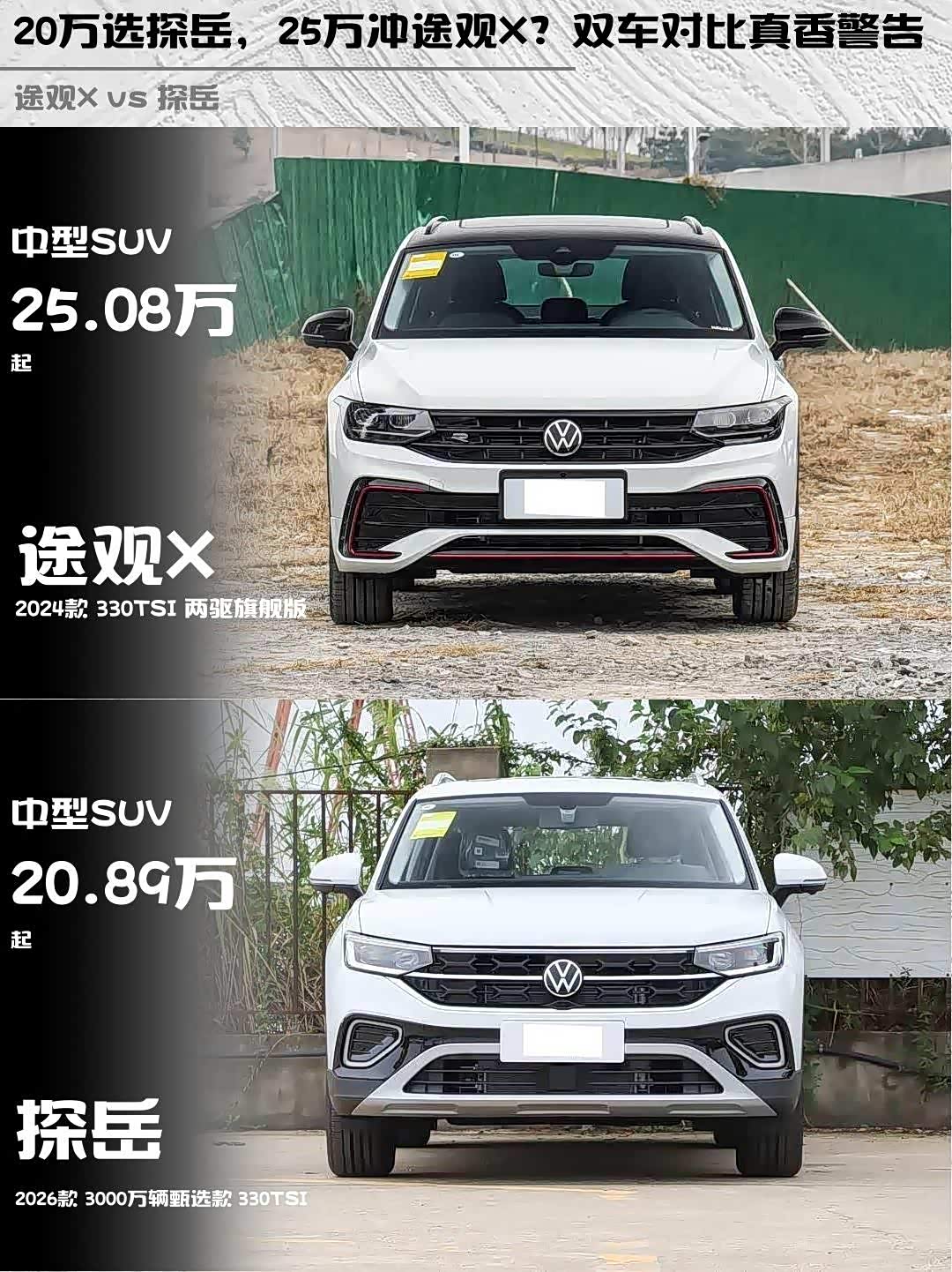 最近在选车的小伙伴看过来!今天给大家深度对比两款热门中型SUV—— 途观X(参数|询价) 2024款 330TSI 两驱旗舰版和探岳 2026款 3000万辆甄选款 330TSI,帮你解决选择困难症!🚗💨