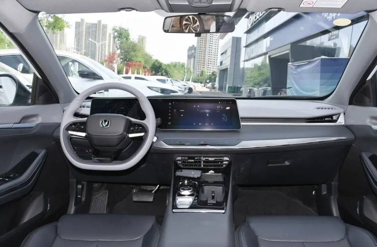 来到内饰,我觉得这台车是有设计感的,没有同质化的外观,也有个性化的内饰设计,但它布局上与逸动是不一样的。双联屏也有12.3+12.3英寸,配的多功能方向盘还有撞色设计,我觉得设计很超前,要知道这是一台几年前的产品了。L2辅助带自适应巡航功能,也令人满意。比如高端配置普及了抬头显示,遮阳帘也有了。那相比国产其它品牌,长安在工艺上的很给力,设计上也很长安,就是皮革的缝线很细腻,然后也有保留有实体按键,比如一键切换360°影像,保留有游艇式档把,还有不错机械感。那它车机也是支持手机投屏,包括座椅布局的风格也很运动,细节上也加入菱形格造型。那标配功能也有定速巡航、倒车影像、上坡辅助、胎压监测和语音唤醒这些,我觉得现在价格直接上顶配最合适了。