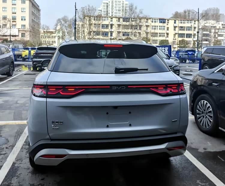 车尾位置,其贯穿样式的尾灯,中间嵌入了品牌英文字母标识,两侧则有狭长间断式LED灯带以及标志性的“中国结”样式,可在点亮后持续营造酷炫感并展现比亚迪品牌车型辨识度。