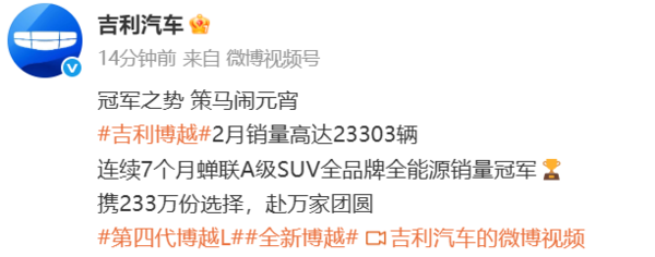 吉利博越连续7个月蝉联A级SUV销冠 2月销量23303辆