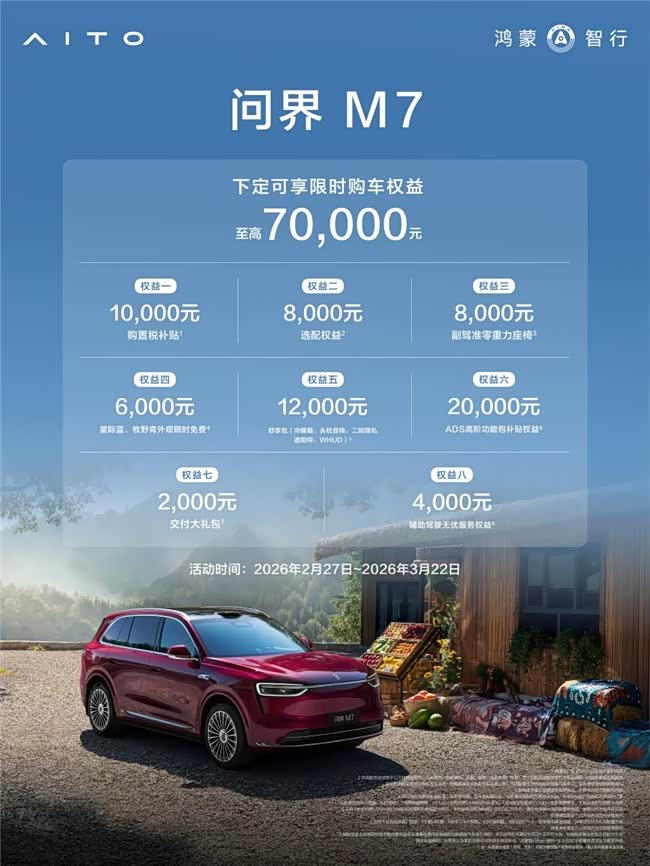 春暖花开,正是带上家人、约上好友,奔赴一场山野烂漫的好时节。一辆称职的座驾,不仅是代步工具,更是移动的幸福空间。近日,问界M7推出了一项“含金量”十足的限时购车权益,不仅延续了以往的丰厚政策,更精准地瞄准了当前车市的“痛点”——购置税,为消费者带来了实实在在的购车“大礼包”,让高品质的智慧出行触手可及。