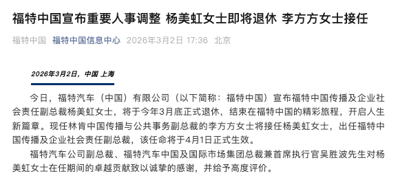 3月2日,福特中国发布公告,中国传播及企业社会责任副总裁杨美虹女士,将于今年3月底正式退休。