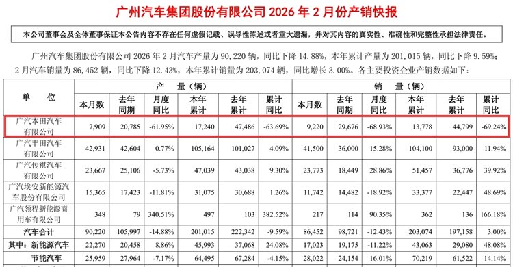 根据广汽集团公开的产销快报显示,2月销量86452台,同比下滑12.43%。今年前两个月累计销量203074台,同比增长3%,其中,新能源汽车累计销量29080台,同比增长48.08%。整体上来说,广汽集团销量回暖的势头已出现。