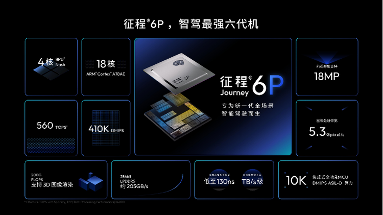 iCAR V27搭载了地平线征程 6P 芯片,单颗算力560TOPS,搭配 27 颗高精度传感器(含激光雷达) ,让车辆看得更远、反应更快、决策更准。地平线自研的新一代BPU 纳什架构,专为 Transformer 大模型实时推理深度优化,让芯片与算法天生一体。创新的存储系统和控制系统能大幅提升数据处理效率、降低系统延迟、实现持续学习。充足的算力冗余为车辆长期 OTA 进化预留了空间,实现 “上市即领先,五年不过时”。
