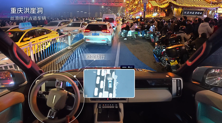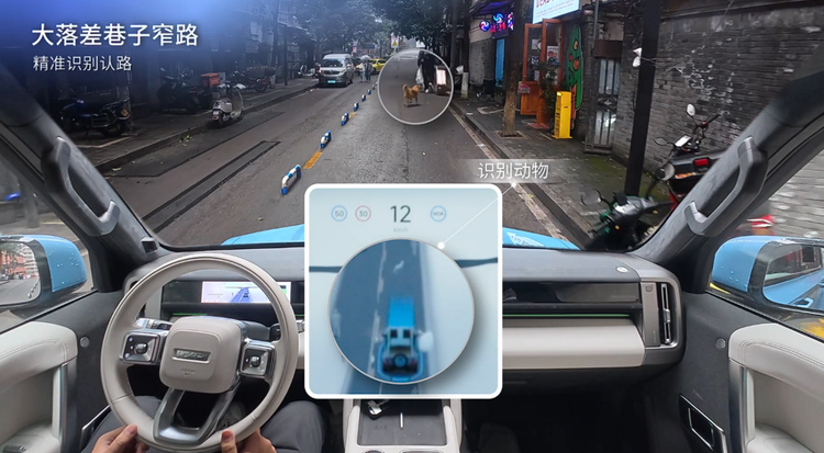 “真人感”的核心,是智驾系统对人类驾驶逻辑的深度复刻与优化,也是高阶智驾与基础智驾的核心分界点。iCAR V27搭载的超级猎鹰700+辅助驾驶系统,基于地平线HSD解决方案打造,采用真一段式端到端架构,依托海量国宾级驾驶员驾驶数据完成模型训练,具备成熟的防御性驾驶与动态博弈能力。系统决策时延低至160毫秒,较人类平均反应速度提升42%,可针对突发路况实现快速响应。在重庆、北京等城市的复杂路况实测中,该系统可在人车混行路段、窄路会车、盲区转弯等场景中,精准识别各类交通参与者,提前预判加塞、横穿等风险行为,平稳完成车速与行驶路径调整,在保障行车安全的前提下,兼顾了道路通行效率。同时,系统搭载的云端VLM大模型,赋予了智驾系统对复杂非标场景的深度理解能力,可基于交通标识、道路环境与周边车辆行为完成综合决策,顺利完成串联掉头、无GPS信号地下环道通行等传统智驾系统难以适配的场景,实现了对人类驾驶思维的高度拟合。