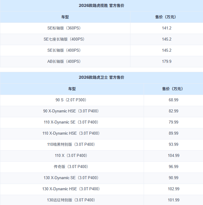 车家号·0浏览·2026-03-03 18:05 · 广东日前,2026款路虎揽胜与卫士正式上市,其中 揽胜(参数|询价)推出4款车型,售价141.2-179.9万元;卫士共计10款车型,售价68.99-104.99万元。