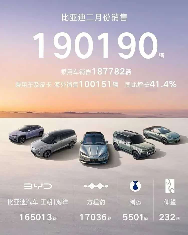 传统车企的分化同样严峻。比亚迪2月卖了190190辆,环比降9.4%、同比降的更厉害,剔除出口部分,其国内市场的销量为9万余辆。但是,比亚迪出口超10万辆是个新突破,并且这是其首次实现单月出口量超越国内市场销量。