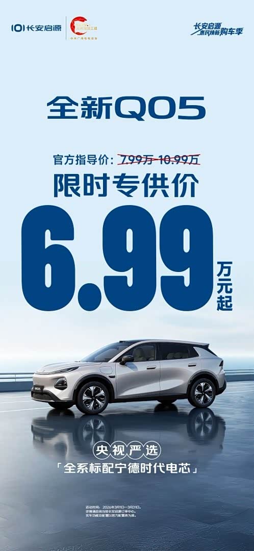 车家号·0浏览·2026-03-03 18:42 · 江西对“细节”有执念的人,选车真的会挑花眼。长安启源全新Q05春季活动直接终结纠结,405 Air版新春专供价6.99万起,405 Max版7.99万起,全国无任何购车限制,全程无套路,3月31日活动结束即恢复原价,这波性价比错过真的难再遇。