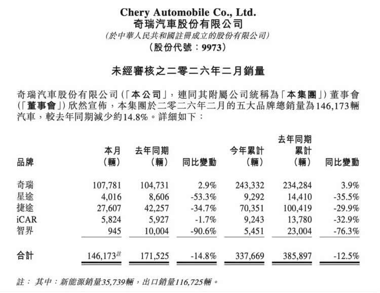 日前,奇瑞集团公布2026年2月销量数据。