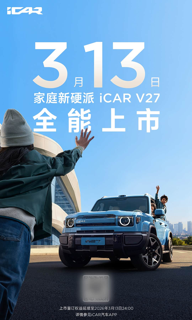 iCAR V27(参数|询价)的上市日期定在了3月13日。目前,新车的预订已经启动。根据已知信息,这款车将提供三种配置选择,不同配置主要在轮胎、动力性能、续航能力以及智能驾驶辅助系统层面存在差异。全系车型将标配高通8295P芯片。