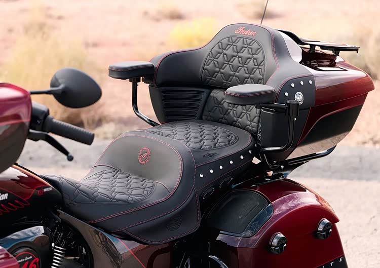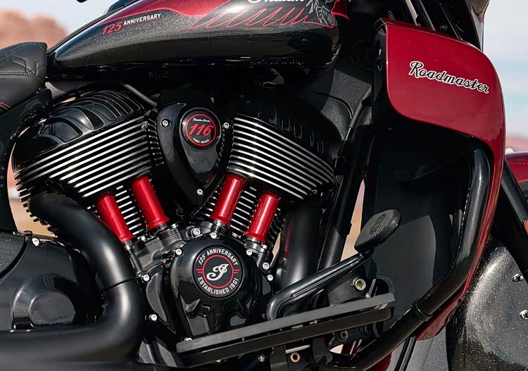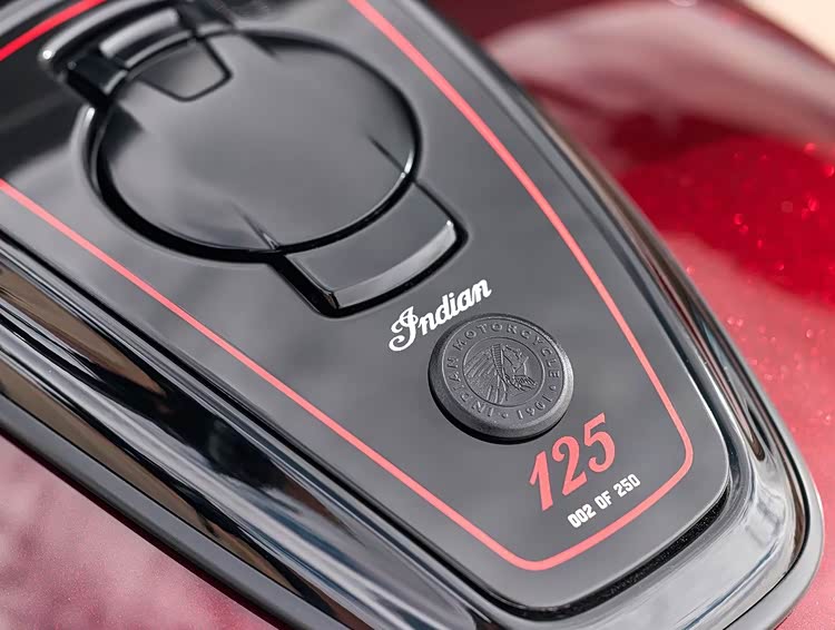 这次的 125 周年纪念系列在视觉上极其考究,印第安特别调制了一款带有金属微粒的红黑水晶漆面,以品牌标志性的「印地安红」为核心,透过微小的金属片营造出层次丰富的光泽感,每一辆纪念版车型都拥有手工绘制的金线与专属徽章, 车身上隐约可见「One Hundred Twenty-Fifth-Anniversary」的字样; 此外,每辆车都有独一无二的序列编号,象征其不可取代的收藏地位。