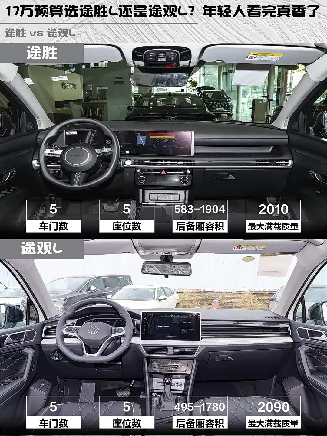 途胜L虽然定位紧凑型,但后备箱583-1904L的扩展能力简直逆天,后排纯平放倒能当双人床。途观L作为中型SUV,495-1780L的容积也不差,但后排地台凸起是个小遗憾。两车都配了全景天窗,采光效果都很棒~
