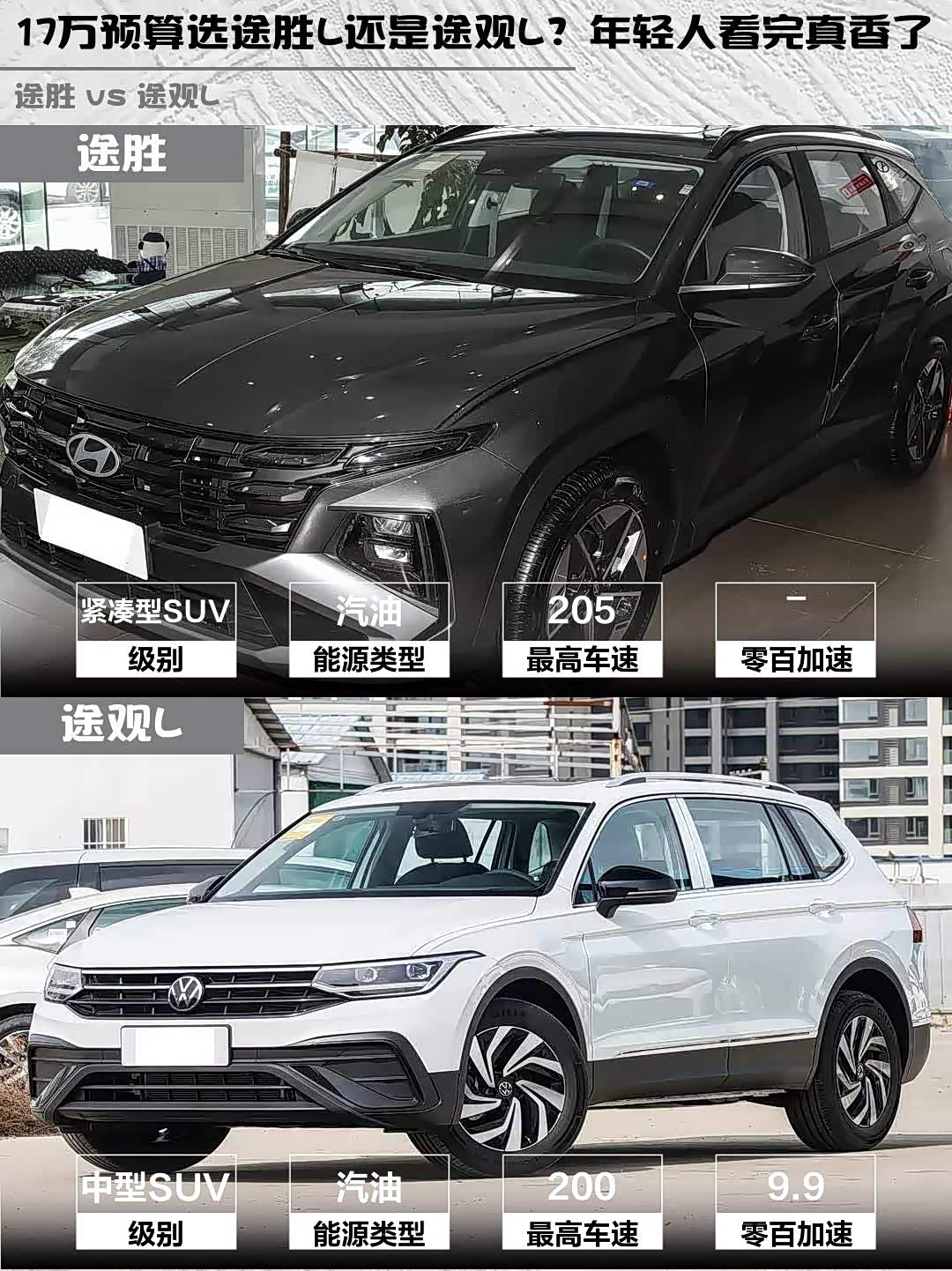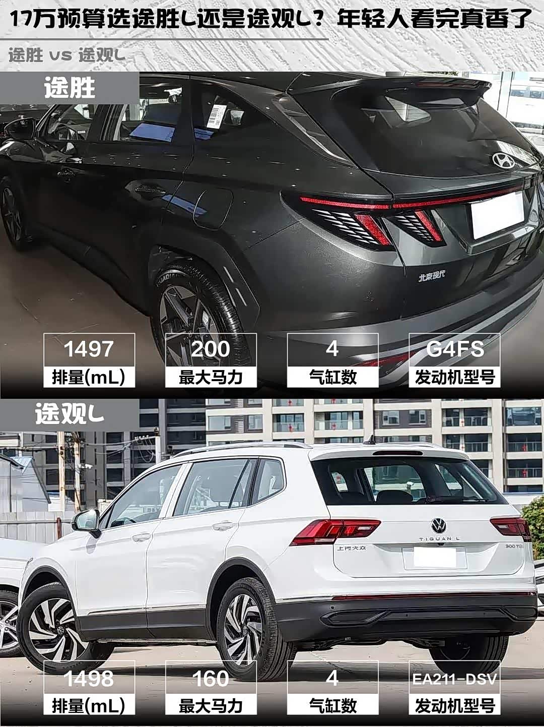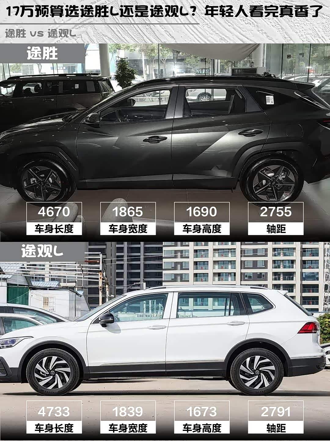 要动力强+空间魔术师选途胜L,要品牌认可度+油耗经济性选途观L。年轻人推荐途胜L的苍松绿哑光漆,超有个性;商务需求多就选途观L的玄武黑,稳重大气。