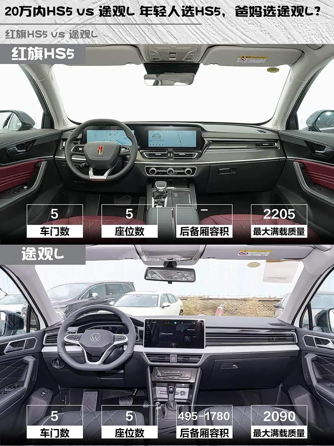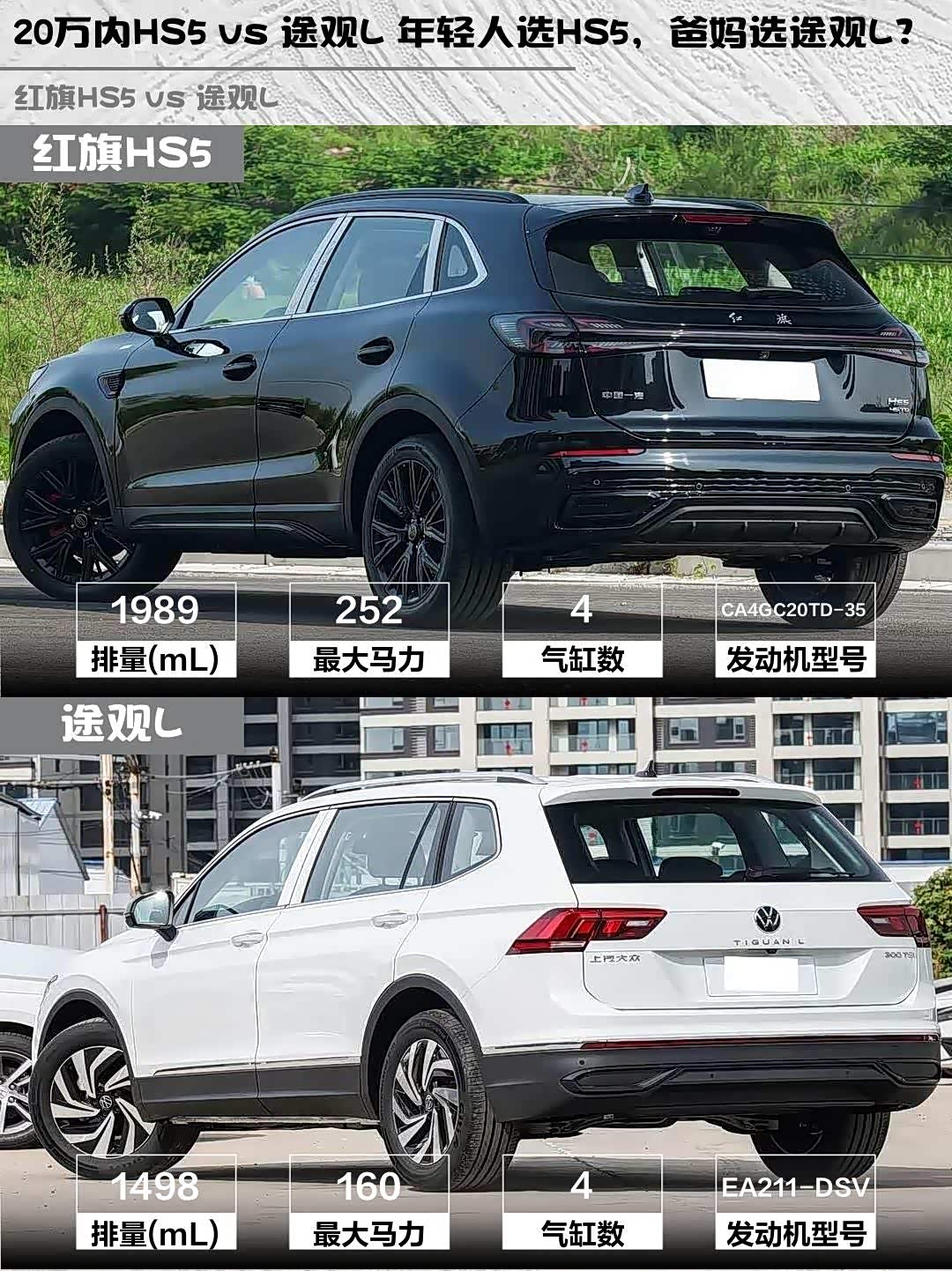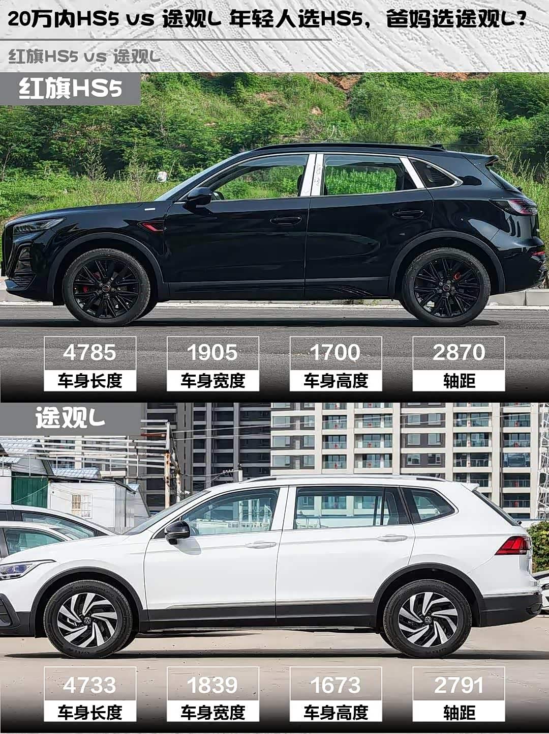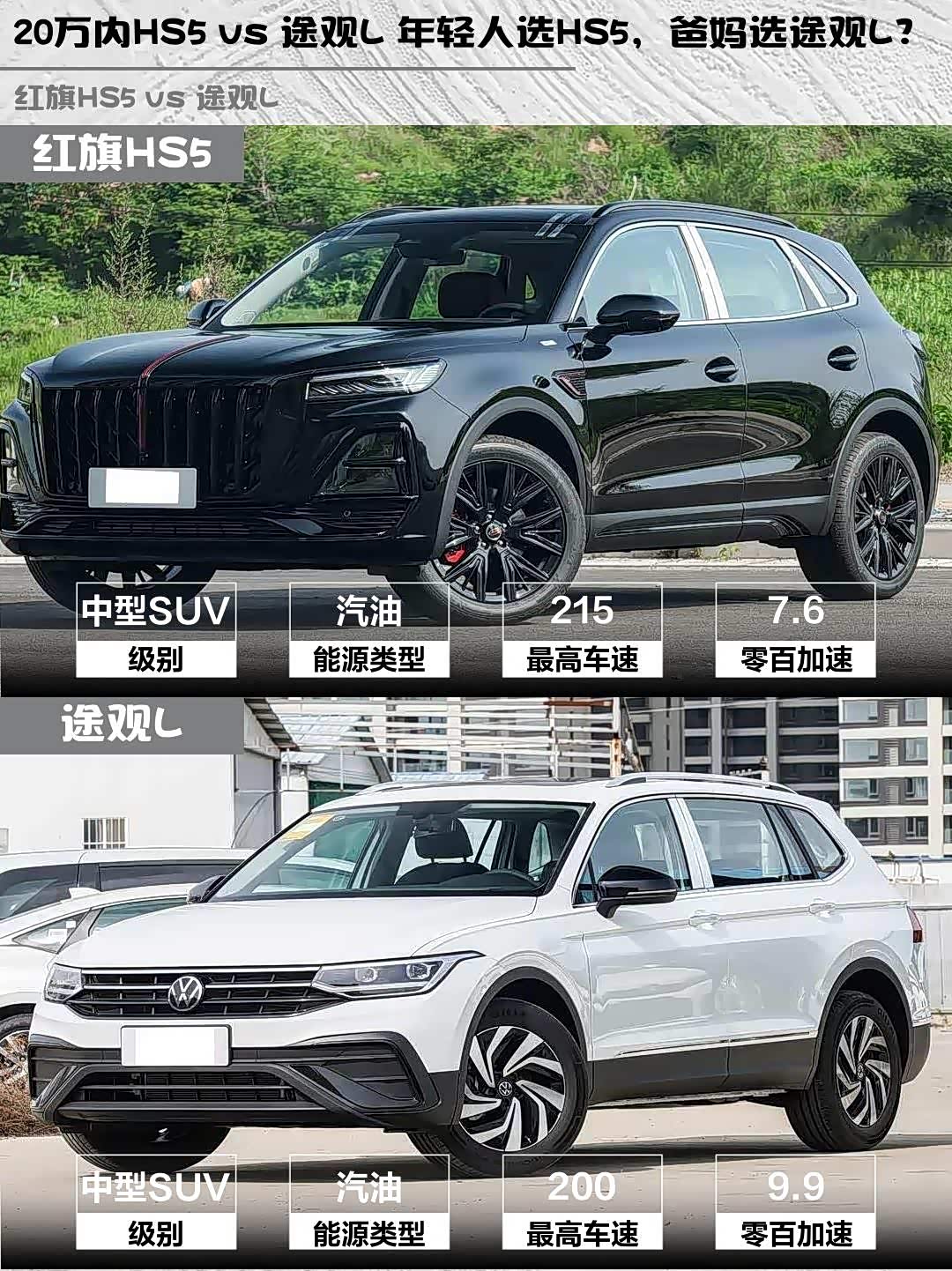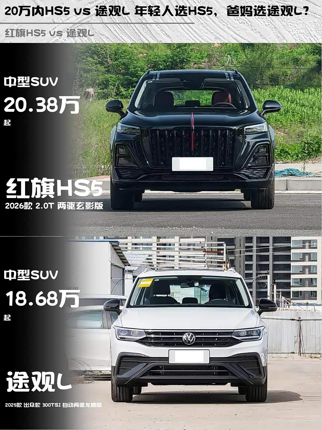 最近在选20万级中型SUV的朋友看过来! 红旗HS5(参数|询价) 2026款 2.0T两驱玄影版和途观L 2025款出众款300TSI自动两驱龙腾版深度对比,看完这篇你就知道怎么选啦~✨