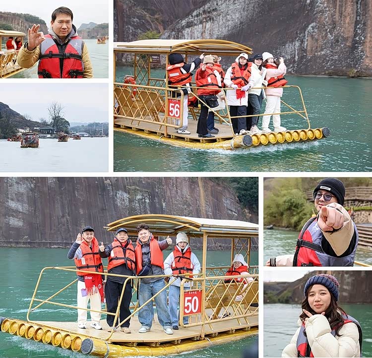 午后的九龙水寨竹筏逍遥游更是惬意十足。大家乘竹筏顺流而下,欣赏“小桂林”般的丹霞画廊,狮子岭、潜龙峡、逍遥洲、月牙湾等景点依次掠过,一阵阵欢声笑语回荡在青山绿水间。