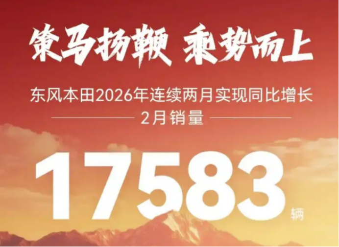 3月1日,东风本田官方发布2026年2月销量数据,单月销量17583辆,同比增长10.1%,继1月实现同比增长后,连续两个月保持同比正增长。