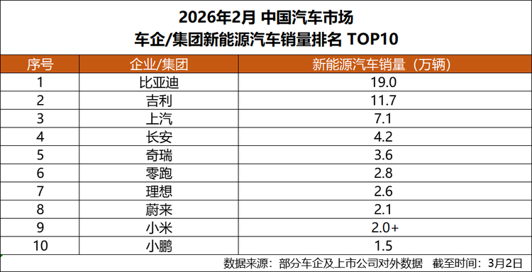 车家号·0浏览·2026-03-04 09:47 · 辽宁2026年开局,中国新能源汽车市场竞争格局进一步明朗。根据车企及上市公司对外披露的数据,比亚迪集团2月新能源汽车销量达190190辆,再度位居行业首位,在主流车企中持续保持明显领先优势,以稳定而强劲的表现巩固头部地位。