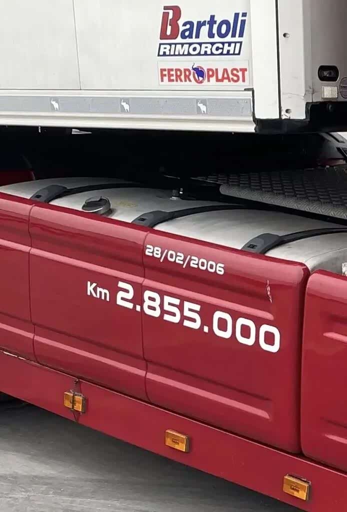 这辆车是第一代生产的斯堪尼亚R系列,搭载着欧三排放标准的V8发动机。上周末,它刚刚度过了自己在公路上驰骋的整整20个年头。为了纪念这一时刻,它的车主——一位意大利个体运输司机——在车身上贴上了一组具有象征意义的文字,记录着2026年2月28日这一天,以及当日达到的行驶里程:285.5万公里。