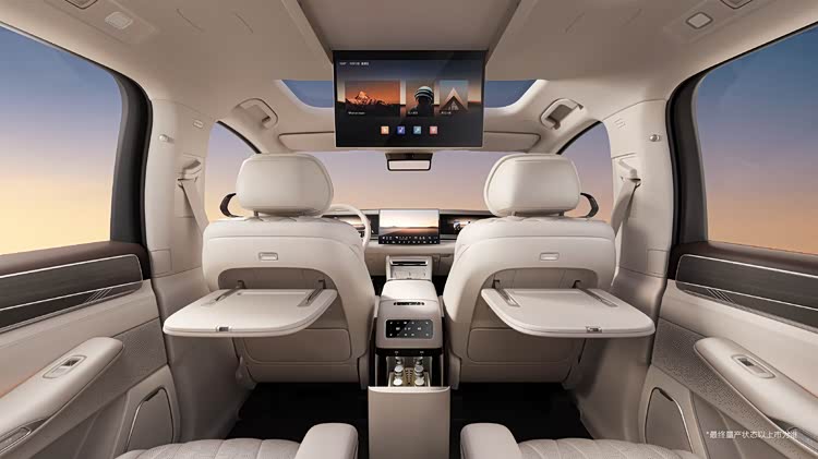 座椅方面采用了2+2+3的七座布局,第二排是两个独立座椅,而且预留了中央通道,前排扶手箱内部集成有冷暖冰箱,车顶有吸顶式娱乐屏,后排小桌板也没有缺席。全车座椅支持电动调节和加热功能,第三排座椅中间也能看到头枕,所以确定是7座布局。