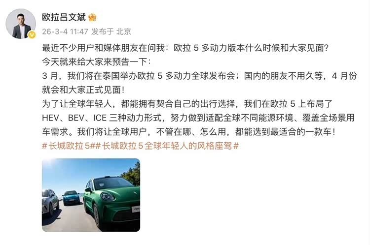 车家号·0浏览·2026-03-04 15:05 · 北京3月4日,长城汽车欧拉品牌总经理吕文斌在社交媒体上宣布,3月将在泰国举办 欧拉5(参数|询价)多动力全球发布会,国内的朋友不用久等,4月份就会和大家正式见面。欧拉5布局了HEV、BEV、ICE三种动力形式,纯电版本此前已经上市,而燃油和混动版也已在工信部2月的申报信息中出现。