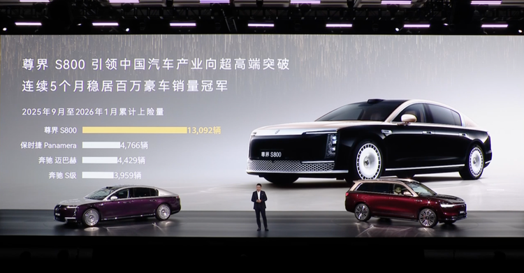另一款旗舰车型尊界S800,定位70万元以上超豪华轿车,上市9个月累计交付量超15000辆,连续5个月稳居百万豪车销量冠军,引领中国汽车产业向超高端突破。数据显示,2025年9月至2026年1月累计上险量中,尊界S800以13092辆的成绩超越第二、三名总和。