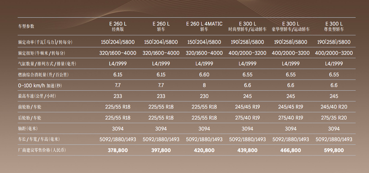 在动力方面,奔驰E级搭载2.0T涡轮增压发动机及ISG智能电机系统,匹配9速自动变速箱。其中,E 260 L系列的发动机最大功率为150千瓦,峰值扭矩320牛·米;E 300 L系列车型的发动机最大功率为190千瓦,峰值扭矩400牛·米。