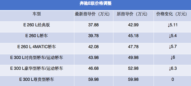 日前,我们从梅赛德斯-奔驰官网获悉, 国产奔驰E级(参数|询价)现已完成价格调整。除了顶配的E 300 L尊贵型轿车,其余车型的官方指导价均实现下调,降幅在5.11万-6.3万元不等。现阶段,国产奔驰E级的最新指导价格区间为37.88万-59.98万元。