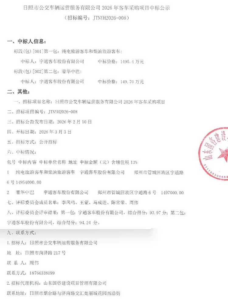 车家号·0浏览·2026-03-04 15:52 · 北京3月3日,日照市公交车辆运营服务有限公司2026年客车采购项目中标公示发布,项目共采购两个标段,分别为纯电旅游客车和柴油旅游客车、豪华中巴,据公告显示,两个标段中标人都为宇通客车股份有限公司,中标价格分别为1495.4万元、149.7万元。