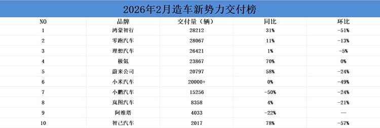 3月伊始,国内造车新势力陆续披露2月交付数据。受春节假期影响,叠加节前需求提前释放、消费者持币观望等因素,主流新势力品牌销量普遍呈环比下滑态势,但同比表现分化明显。整体来看,2万辆成为当月头部品牌的销量分水岭,部分品牌凭借完善的产品矩阵与体系能力实现逆势增长。