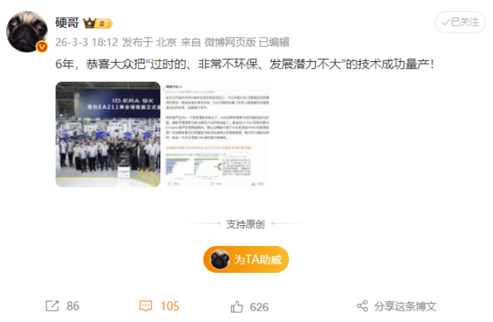 看到这一幕,肯定会有人想到理想汽车。毕竟,当年大众中国某位高管曾说过“增程是过时的技术”。而理想汽车果然也很硬气,其公关部社交媒体总监 “硬哥”发文称:“6年,恭喜大众把‘过时的、非常不环保、发展潜力不大’的技术成功量产!””