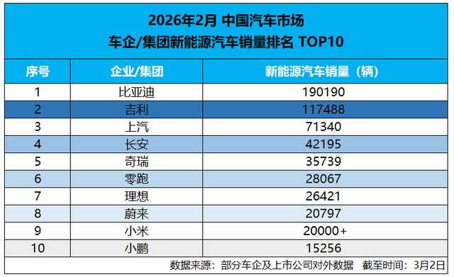 淡季是真的淡,看榜单就知道,第二名的吉利11.7万辆,第三名上汽掉到7万多,后面几家更是2万、3万的水平。这么一对比,比亚迪的19万辆就显得格外扎眼——它几乎是第二名的1.6倍,是第二到第四名的总和。