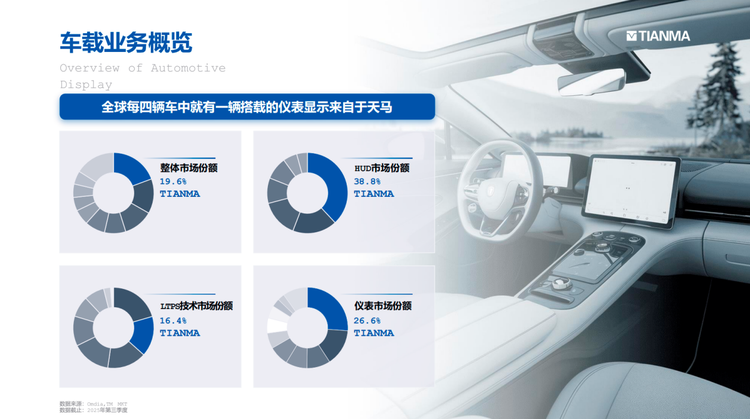 自 2020 年起,天马微电子已经连续 6 年保持全球车规 TFT-LCD、车载仪表显示出货第一。2024 年起,天马HUD显示登顶全球第一,号称「全球每 4 台汽车,就有一台搭载了来自天马的仪表显示产品。」